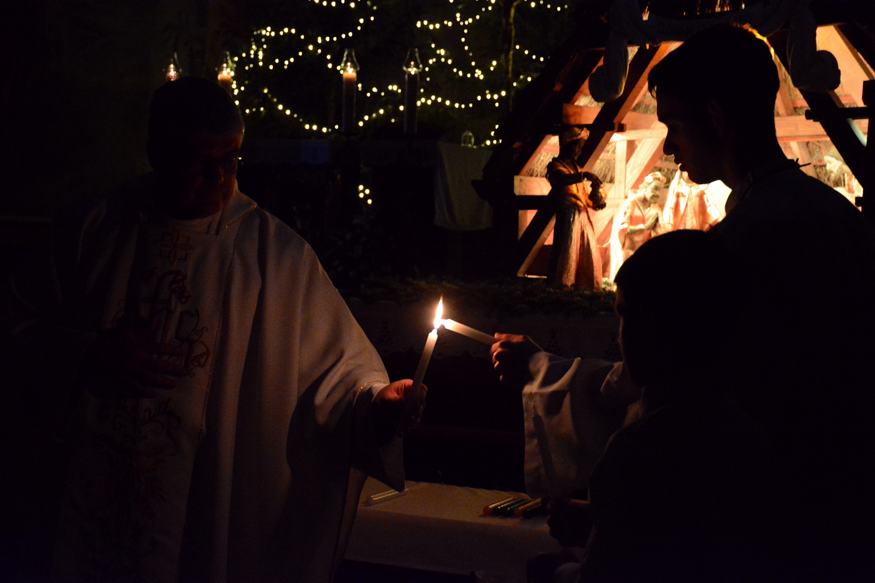 Húsvét vigíliáján elég feltűnő lehetett a templom előtt lobogó tűz, két fiatalember oda is jött és érdeklődve hallgatta meg, hogy az erről meggyújtott húsvéti gyertya fénye fogja hamarosan betölteni a templomot, mint Krisztus világossága. Ha velünk tartottak volna, meghallgathatták volna a gyertyafényben a húsvéti öröméneket, az Exultetet, majd az ószövetségi olvasmányok után újból felzengő glóriát, majd a már fényben úszó templomban a vágyva vágyott ének, az alleluja visszaaadását. Aztán az igehirdetés után a keresztvíz megáldását, a hívek keresztségi fogadalmának megújítását, az eucharisztikus liturgia végén a szentsír megnyitását és a feltámadás örömhírének elvitelét a világba a feltámadási körmenettel. S ha mindezt végigcsodálkozták volna, még a megszentelt kalácsból is jutott volna nekik.